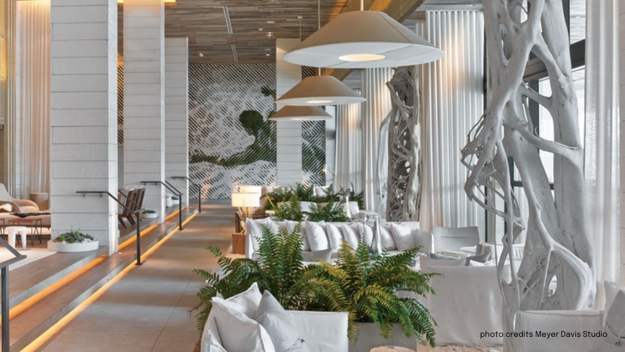 A large part of biophilic design involves using organic materials such as plants, wood elements, and flowers, but their presence can be complemented with textiles in natural color palettes like lush greens and earthy browns - which were prevalent on the tradeshow tour this year.